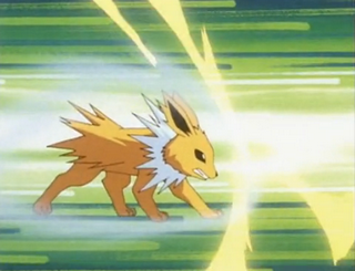 Jolteon je citlivý Pokémon, který je snadno smutný nebo vzteklý. Pokaždé, když změní náladu, nabíjí si energii. Jeho zbraně jsou elektrické útoky s 10 000 volty a špičatá srst. Jolteonovy buňky generují nízkou úroveň elektrické energie. Ostnatá srst tak stojí díky jeho prudce nabité elektřině a je schopen se srstí dost popíchat nepřítele. Buďte velmi opatrní, protože na něj může i údeřit blesk. Praskavý zvuk elektřiny může být slyšet při jeho vydechnutí.